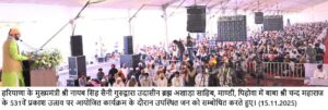 मुख्यमंत्री ने कहा कि वर्तमान सरकार ने चुनाव के दौरान किए गए 217 वादों में से 50 वादों को पहले ही वर्ष में पूरा कर उदाहरण प्रस्तुत किया है। उन्होंने बताया कि हरियाणा देश का पहला राज्य है जहाँ सभी 24 फसलों की खरीद एमएसपी पर की जा रही है। उन्होंने कहा कि हरियाणा राज्य गठन से पूर्व के पट्टेदारों को भूमि का मालिकाना हक प्रदान किया गया है। इसके साथ ही, पंचायत एवं पालिका की भूमि पर 20 वर्षों से अधिक समय से निवासरत परिवारों को भी मालिकाना अधिकार देने का प्रावधान किया गया है। मुख्यमंत्री ने आगे कहा कि अंग्रेज़ों के समय से लागू टैक्स (आबियाना) को पूर्णतः समाप्त कर किसानों को बड़ी राहत प्रदान की गई है। उन्होंने बताया कि दीनदयाल लाड़ो लक्ष्मी योजना प्रारंभ की गई है, जिसके अंतर्गत पात्र महिलाओं को 2,100 रुपये मासिक आर्थिक सहायता नवंबर माह से प्रदान की जा रही है। इसके अतिरिक्त, लगभग 19 लाख गरीब परिवारों की महिलाओं को हर घर–हर गृहिणी योजना के तहत प्रति माह केवल 500 रुपये में गैस सिलेंडर उपलब्ध कराया जा रहा है। मुख्यमंत्री ने इस अवसर पर राज्य सरकार द्वारा चलाई जा रही अन्य कल्याणकारी योजनाओं की जानकारी भी साझा की।