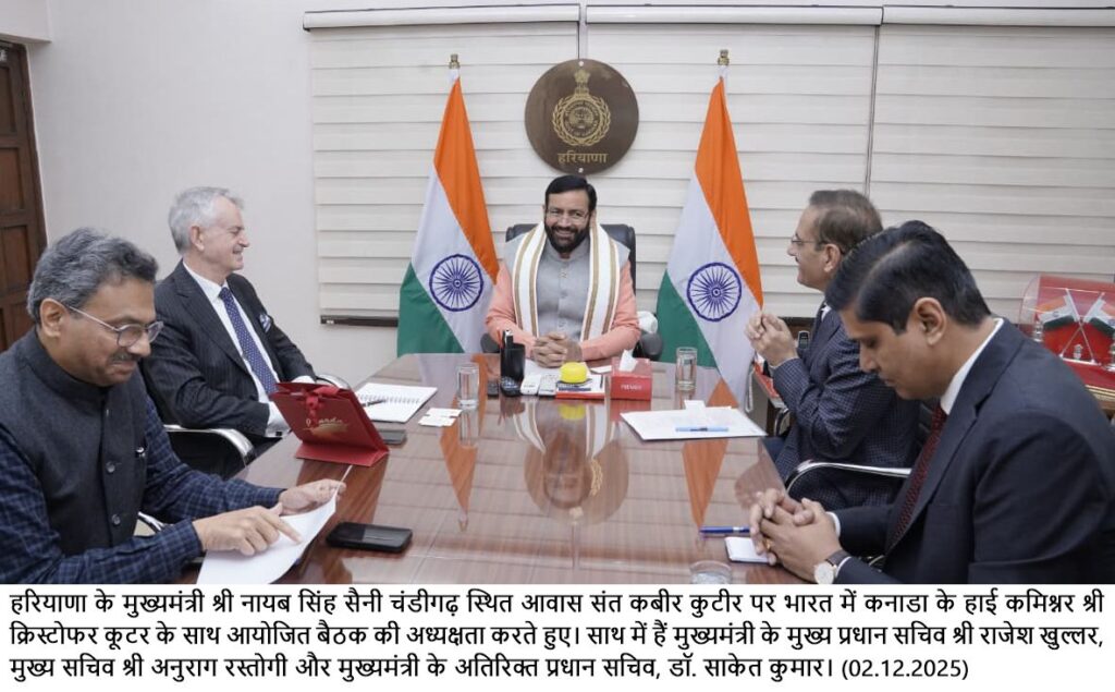 हरियाणा के मुख्यमंत्री नायब सिंह सैनी के नेतृत्व में राज्य सरकार हरियाणा को शिक्षा के क्षेत्र में वैश्विक हब बनाने के लगातार प्रयास कर रही है। इन्हीं प्रयासों की कड़ी में मंगलवार को भारत में कनाडा के राजदूत क्रिस्टोफर कूटर ने मुख्यमंत्री श्री नायब सिंह सैनी से उनके निवास स्थान संत कबीर कुटीर पर शिष्टाचार भेंट की।