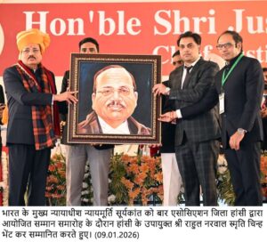 हांसी जिला बार एशोसियशन के प्रधान पवन रापडिय़ा ने मुख्य न्यायाधीश व अन्य अतिथिगण का स्वागत किया। उन्होंने मुख्य न्यायाधीश न्यायमूर्ति श्री सूर्यकांत को पगड़ी, पटका व स्मृति चिन्ह भेंट कर सम्मानित किया। एडवोकेट सुमन रापडिय़ा ने मुख्य न्यायाधीश की धर्मपत्नी श्रीमति सविता वशिष्ठ को शॉल व स्मृति चिन्ह भेंट किया।